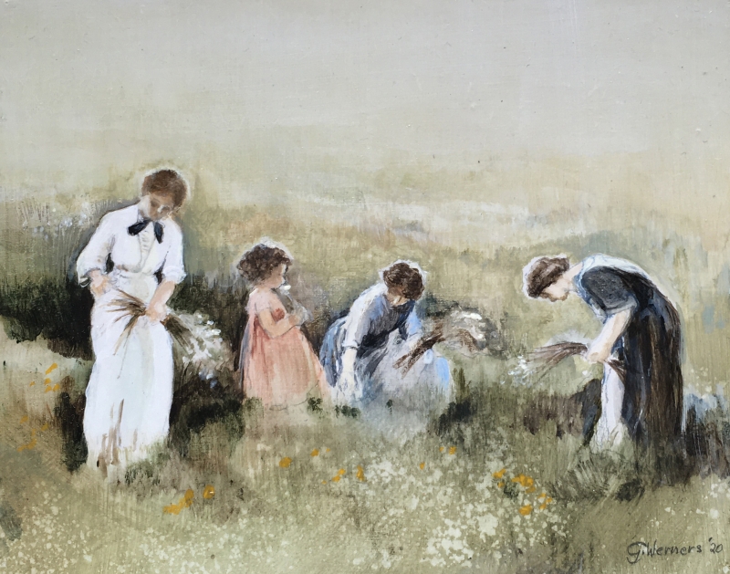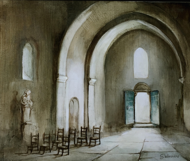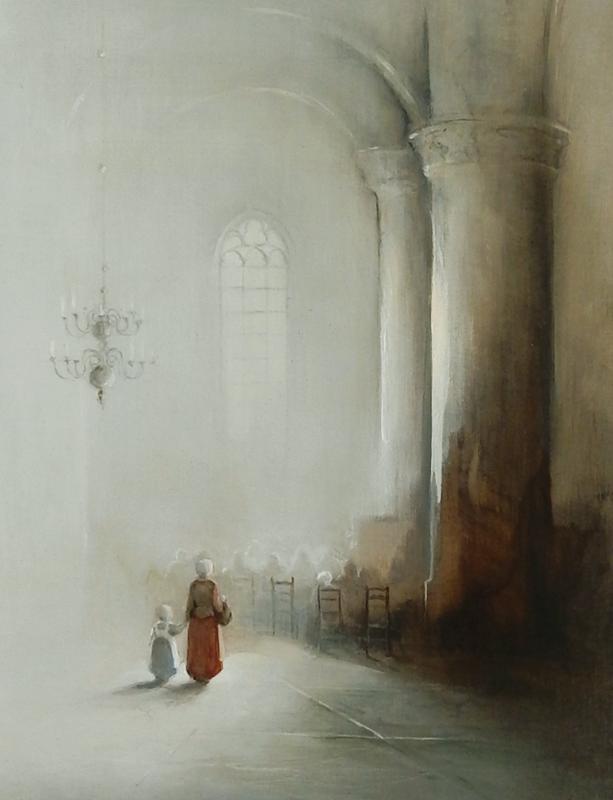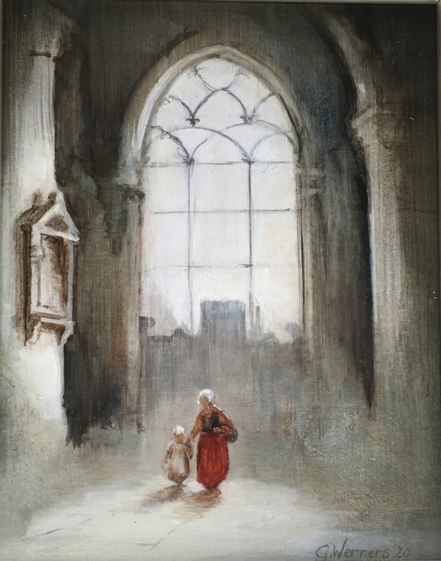 Mijn werk kan je niet in een bepaalde categorie thuis brengen. Ik schilder impressionistisch, maar ik hou er ook van om vanuit een mooie vlek te gaan werken . Soms is het ene deel van mijn schilderij abstract en een ander gedetailleerd uitgewerkt. Ik hou van contrasten. Licht tegen donker of groot tegen klein. Vandaar dat ik ook vaak kerkinterieurs schilder, waar ik o.a. deze beeld elementen in kwijt kan. Ik heb de leraren opleiding aan de Academie in Tilburg gevolgd, waarna ik 35 jaar les heb gegeven. De laatste 23 jaar aan het H.N.L. in Bilthoven. Daarnaast hield ik ervan om te blijven model tekenen en kinderportretten in opdracht te maken.