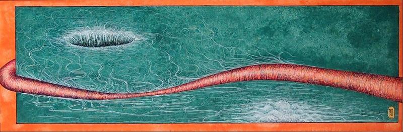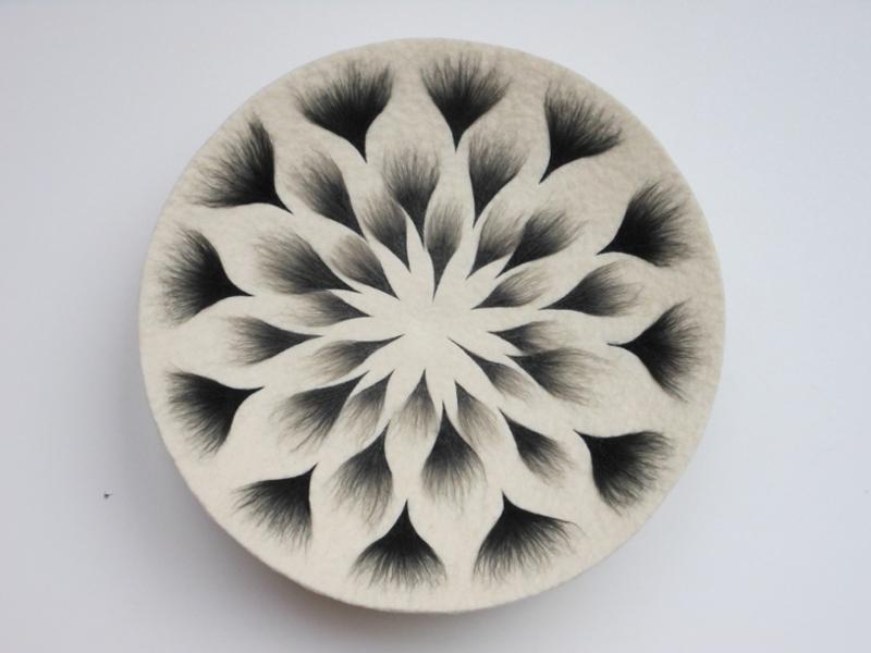 | Het traditionele vilten is hetgeen van waaruit ik grenzen ben overgestoken naar elk willekeurig gebied waartoe ik me aangetrokken voel, dat nodig is om me uit te drukken, of dat me überhaupt in staat stelt om kunst te maken. Na een periode van schetsen- vaak door het schuiven met zwarte papiervormpjes op de vilten basisschaal- heb ik een duidelijk beeld van mijn ontwerp voordat ik begin met de uitvoering ervan. Om mijn specefieke einddoel te bereiken gebruik ik ook technieken en materialen uit andere disciplines. Ik gebruik o.a. een drukmal om de strakke schaalvorm te verkrijgen, en scalpels om grafische afbeeldingen in reliëf te snijden. Indien nodig gebruik ik een schuurmachine om te vilten en de spierkracht van mijn echtgenoot om het vilt te vollen. Terwijl de concave vorm van mijn viltobjecten bescherming en veiligheid biedt aan de vaak kwetsbare inhoud, biedt het vilt zachtheid en warmte. De algemene vormgeving van mijn werk echter oogt krachtig.” |