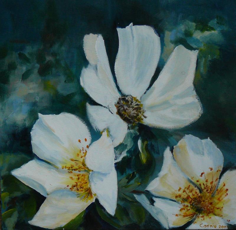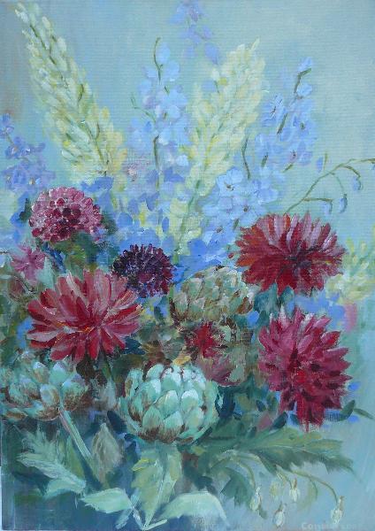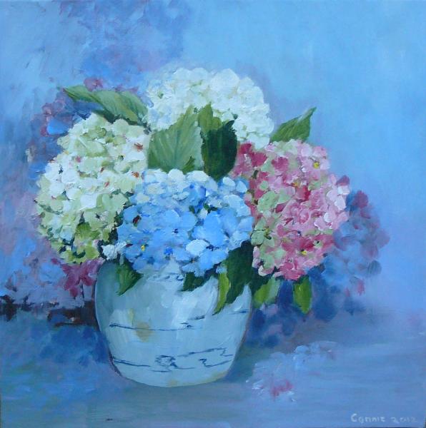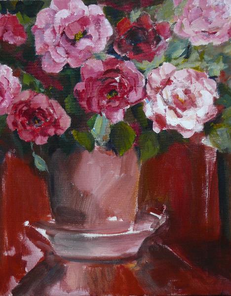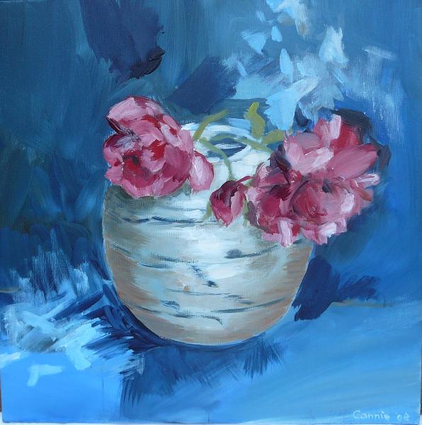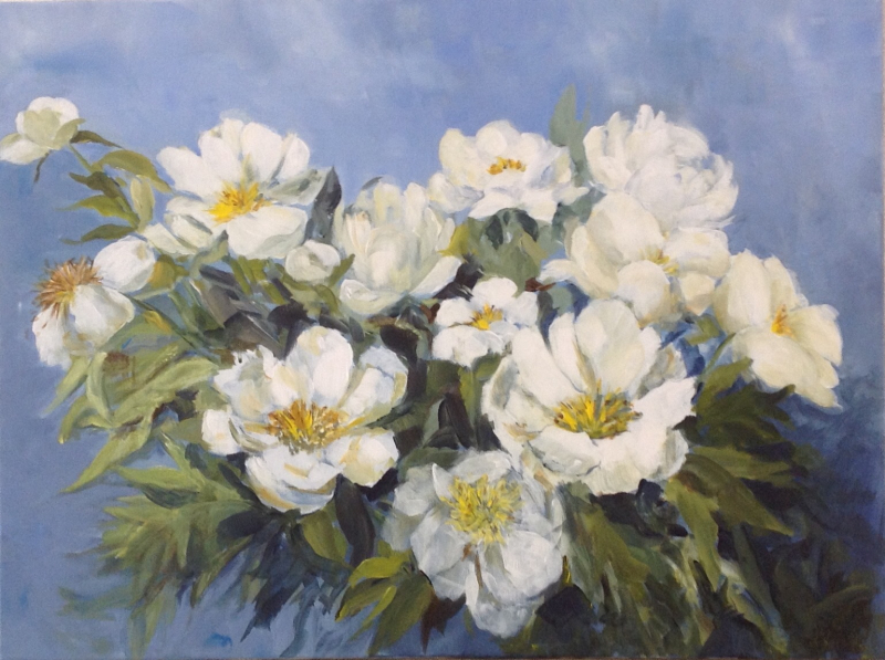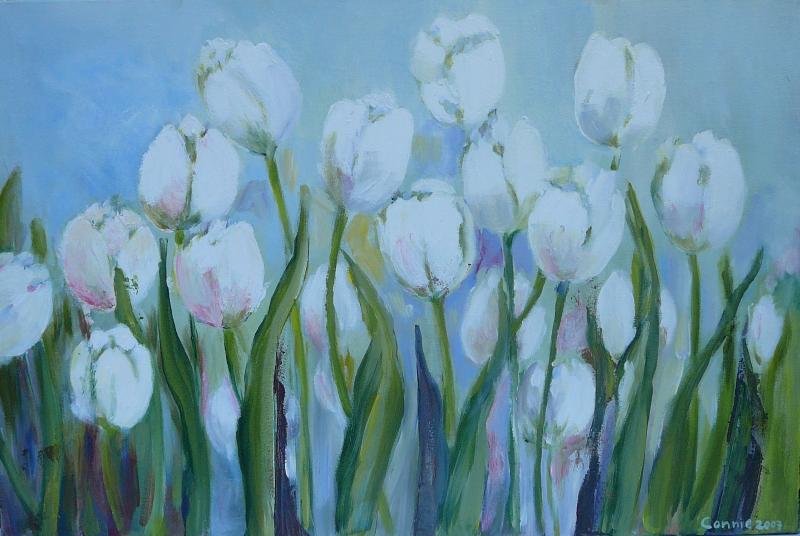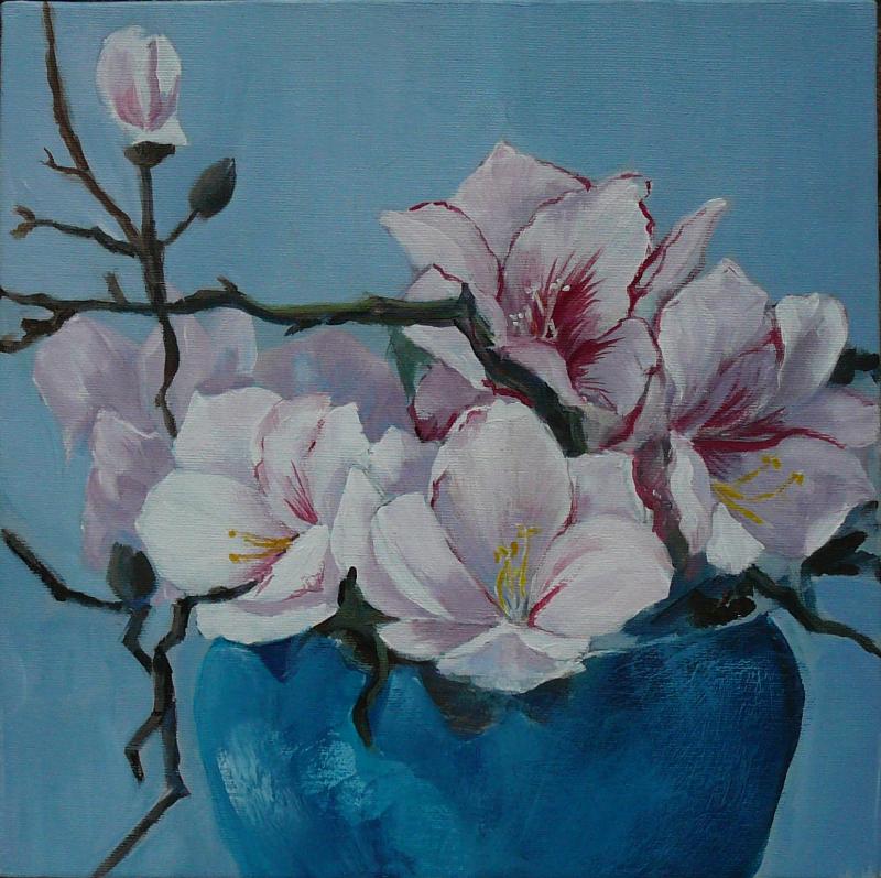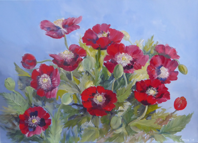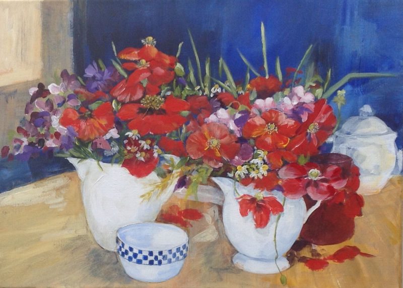 Mijn inspiratiebron is de tuin en alle ongekunstelde "boerderijbloemen" die daarbij horen. Mijn favorieten zijn hortensia's, viooltjes, papavers en tulpen. Maar ik schilder ook landschappen, dieren en stillevens. Maar wat ik ook probeer, altijd verschijnt er toch weer ergens op het doek een bloemetje.